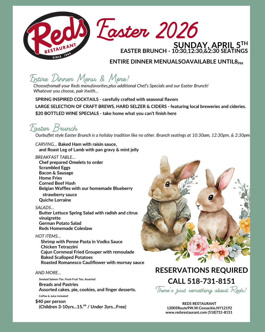 Reservations suggested, although walk ins are always welcome. For RESERVATIONS please CALL 518-731-8151. We do not accept reservations via email or social media. ONLINE ORDERING suggested for Dining to Go Orders.